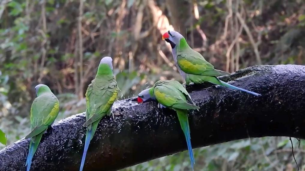 近日,在云南省普洱市念念茅区念念茅港镇茨竹林村芒坝村民小组,成群的国度二级保护动物大紫胸鹦鹉飞临村子周围的榕树嬉戏。