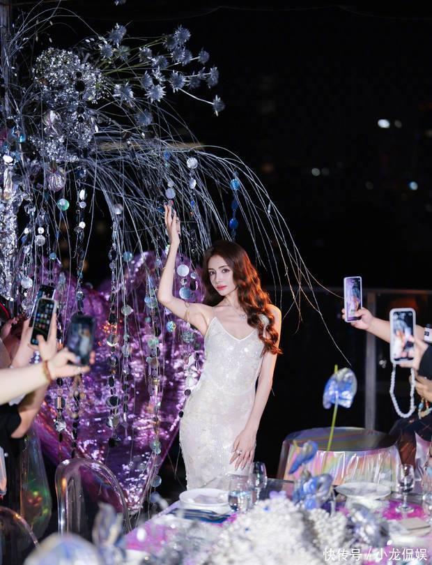 麦迪娜穿紫色长裙,侧颜好考究。