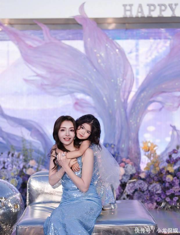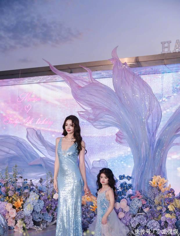 麦迪娜和男儿同穿蓝色系长裙,画面好养眼。