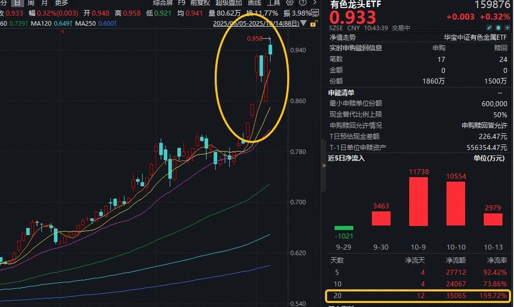 值得热心的是,资金积极抢筹!截止发稿,有色龙头ETF(159876)获资金及时净申购360万份!深交所数据裸露,该ETF近4日畅达吸金,筹谋金额2.97亿元。截止10月13日,有色龙头ETF(159876)最新范围6.35亿元,创历史新高。